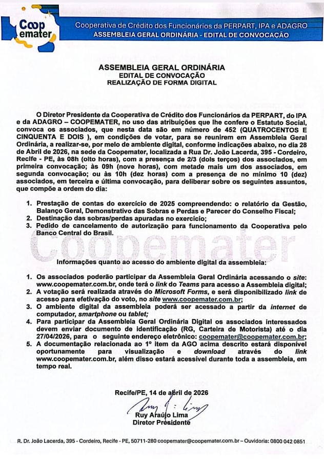 A pedido do presidente da COOPERATIVA DE CRÉDITO DOS FUNCIONÁRIOS DA PERPART, DO IPA E DA ADAGRO – COOPEMATER, convoca seus cooperados para participação da Assembleia Geral Ordinária dessa entidade, marcada para o dia 28 de abril de 2026, de forma virtual. Seguem, também.
